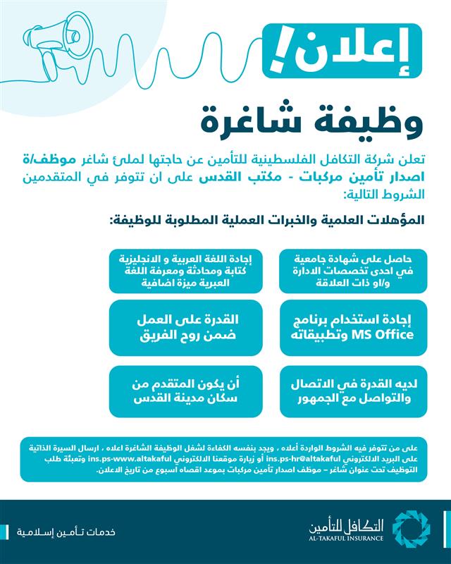 تعلن شركة التكافل الفلسطينية للتأمين عن حاجتها لشغل وظيفة موظف/ة إصدار تأمين مركبات في مكتبها بمدينة القدس.
