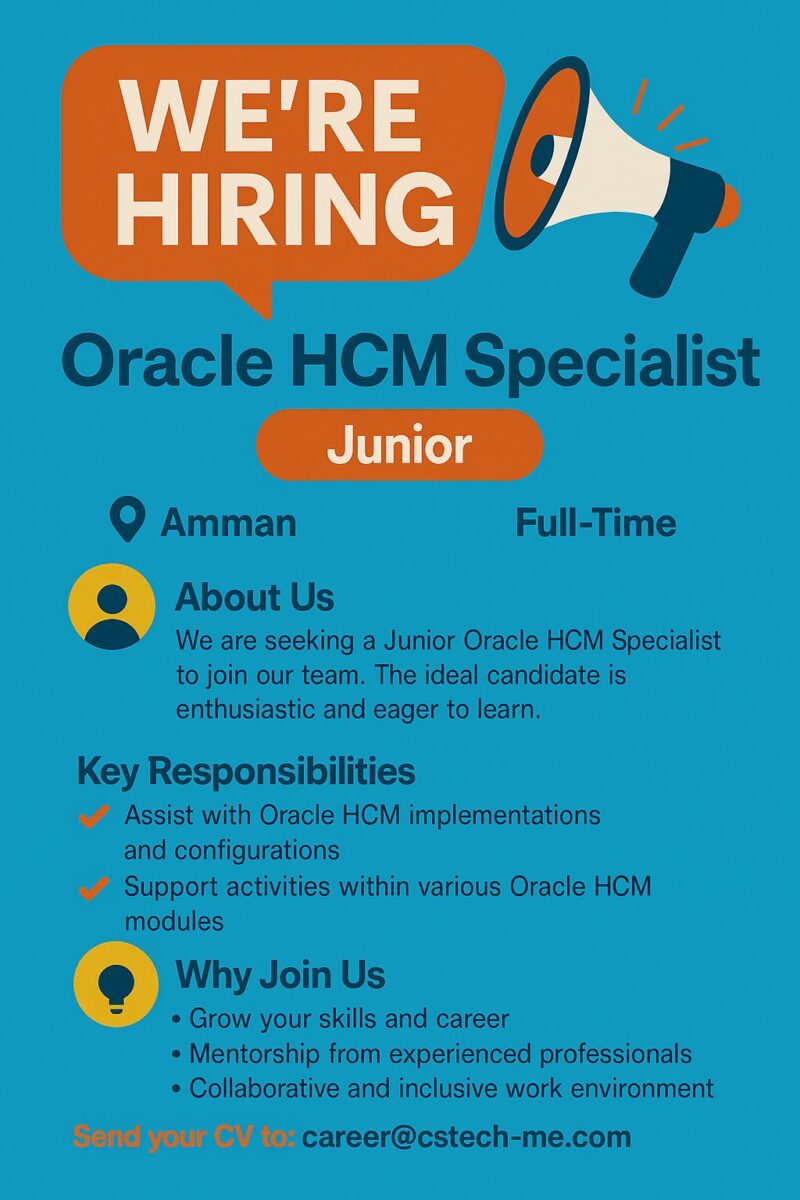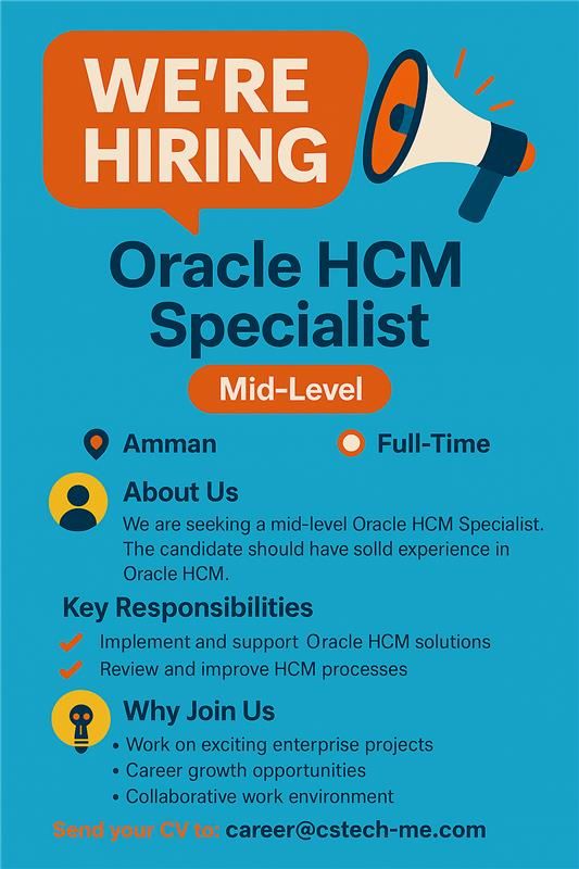 تعلن شركة CS-Tech عن توفر وظائف شاغرة في عمّان لعام 2025 بمجال Oracle HCM، من حديثي التخرج وحتى أصحاب الخبرة.