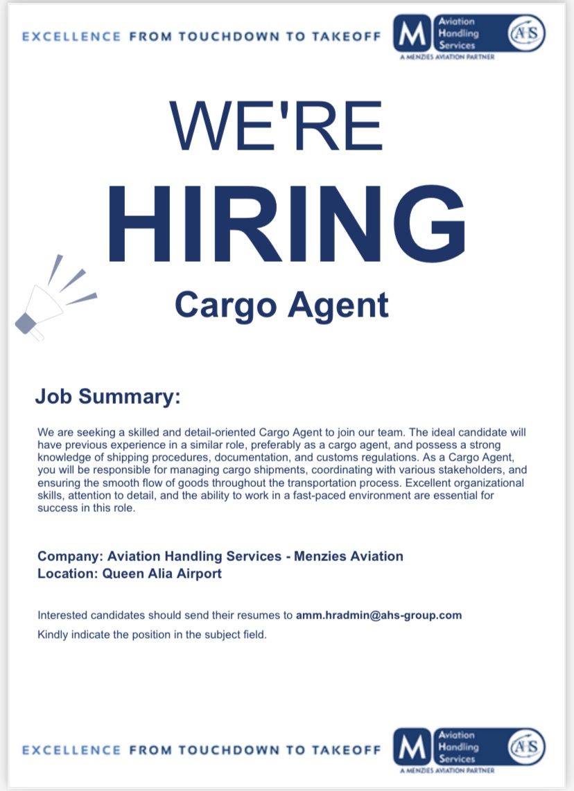 وظائف Cargo Agent مطار الملكة علياء 2025