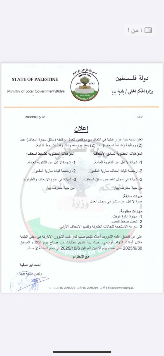 📌 مكان العمل: سلفيت – بديا