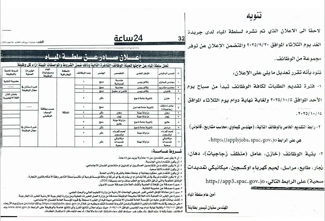 أعلنت سلطة المياه الأردنية عن توفر وظائف حكومية شاغرة في الأردن لعام 2025، في عدد من التخصصات الهندسية، الإدارية، القانونية، المهنية، والفنية، وذلك وفقًا للشروط الموضحة لكل وظيفة: