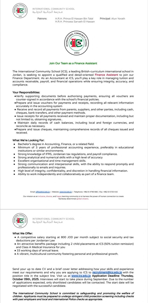 وظائف مساعد مالي في المدرسة الدولية – الأردن 2025