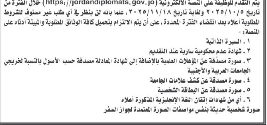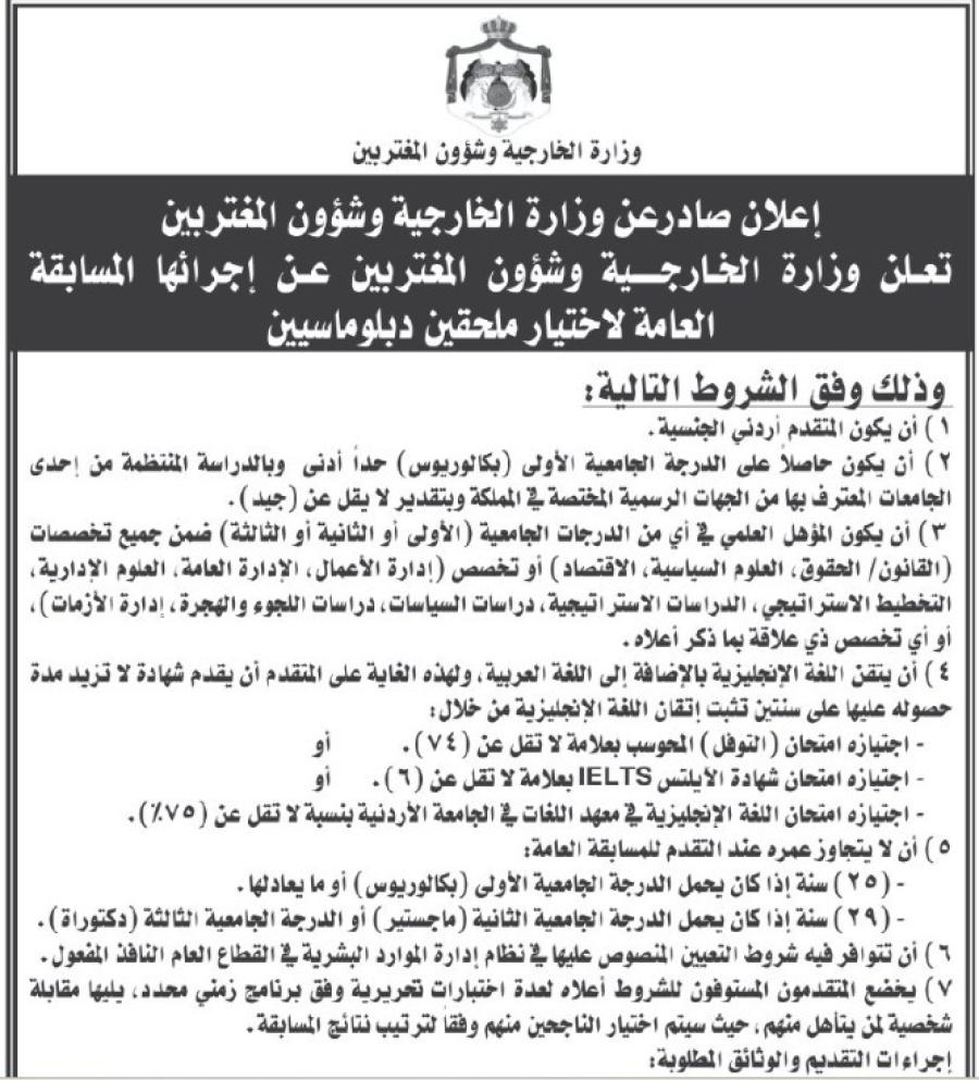 أعلنت وزارة الخارجية وشؤون المغتربين في الأردن عن إجراء المسابقة العامة لاختيار ملحقين دبلوماسيين لعام 2025، وفقًا لشروط محددة تشمل المؤهل العلمي، التخصص، إتقان اللغة الإنجليزية، والعمر.