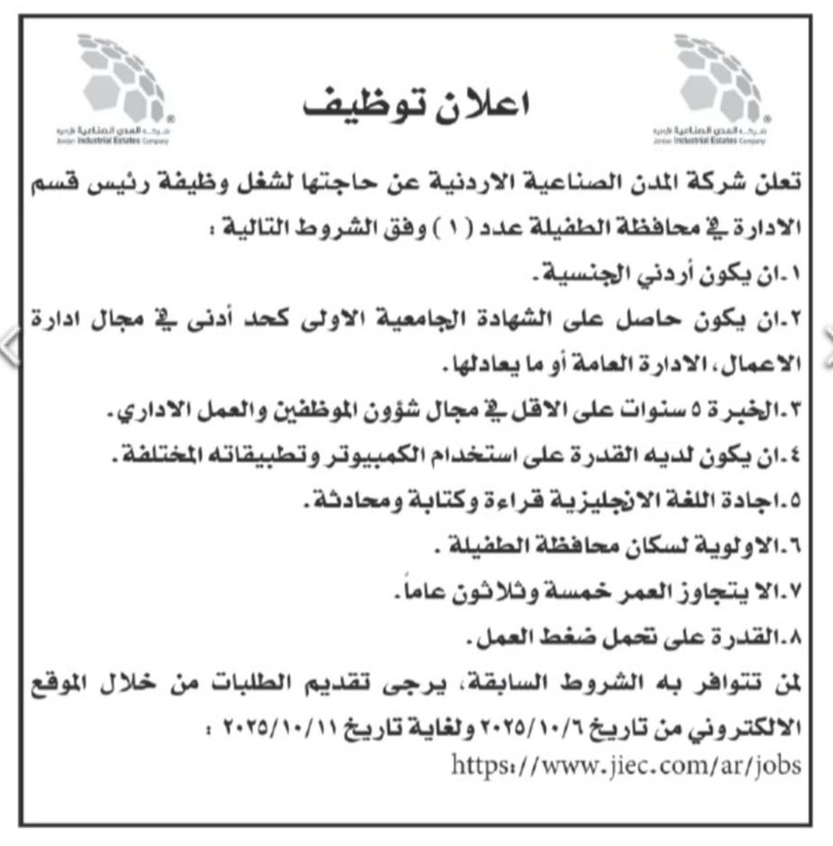 تعلن شركة المدن الصناعية الأردنية عن حاجتها لتعيين رئيس قسم شؤون الموظفين في محافظة الطفيلة لعام 2025. الوظيفة تتطلب شهادة بكالوريوس في إدارة الأعمال أو ما يعادلها، مع خبرة في المجال، وإجادة استخدام الكمبيوتر واللغة الإنجليزية.