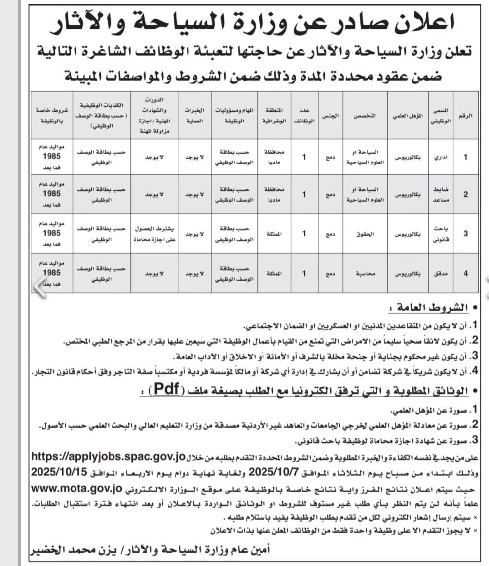 أعلنت وزارة السياحة والآثار الأردنية عن توفر وظائف شاغرة لعام 2025 في عدة مدن أردنية منها البترا، قلعة الكرك، وعمان، وفق نظام العقود المحددة.