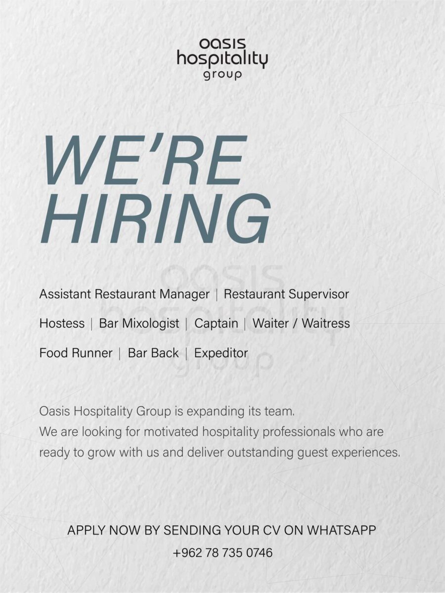 تُعلن Oasis Hospitality Group في عمان عن فتح باب التوظيف لعام 2025 لتوسيع فريقها بمجموعة من وظائف الضيافة المتميزة.