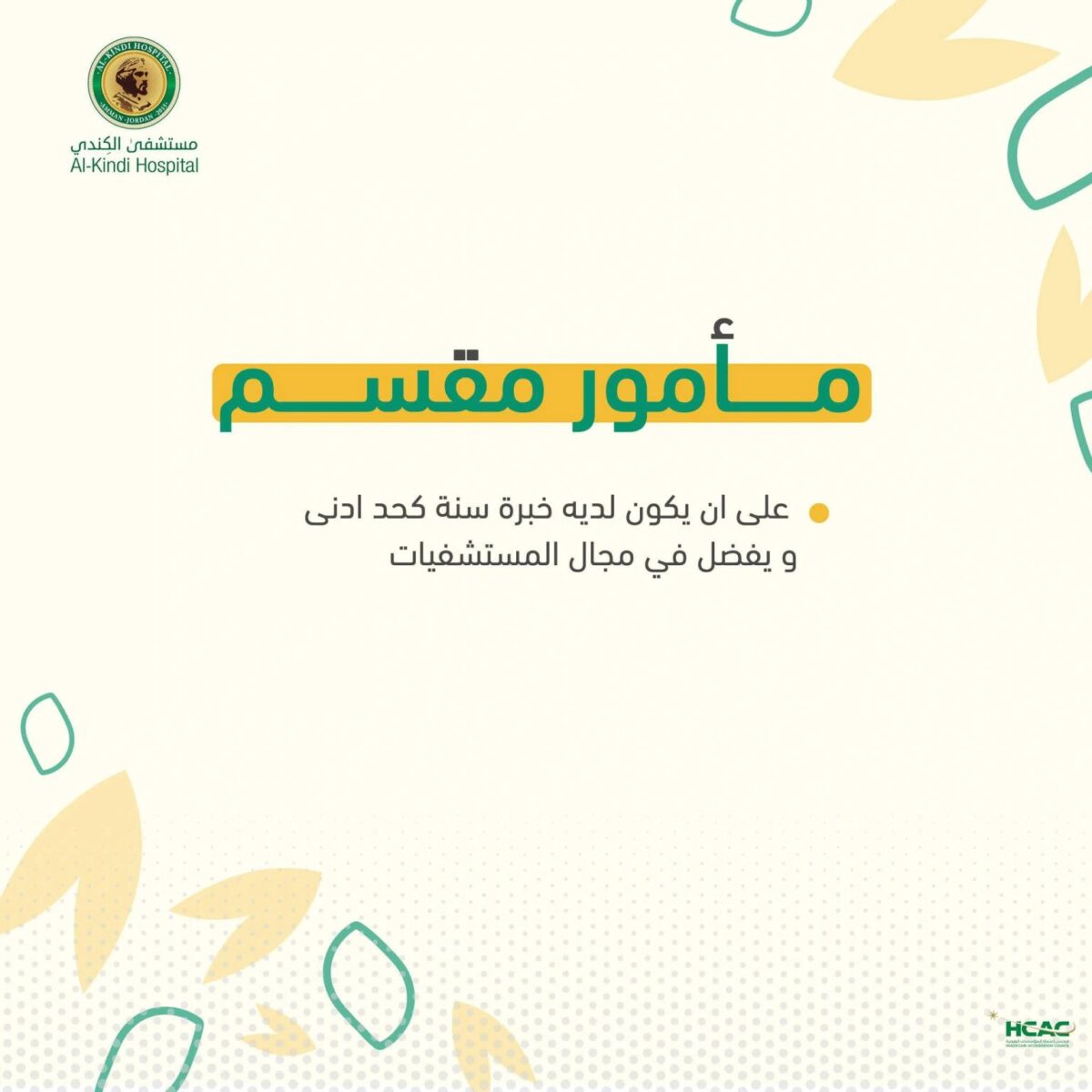 مأمور مقسم بخبرة للمستشفيات – فرصة في مستشفى الكندي