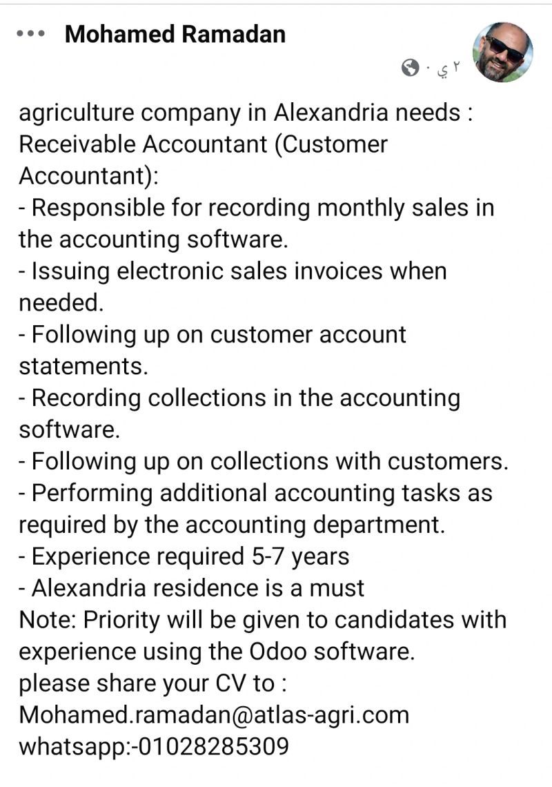 🧾 مطلوب محاسب عملاء – شركة زراعية بالإسكندرية