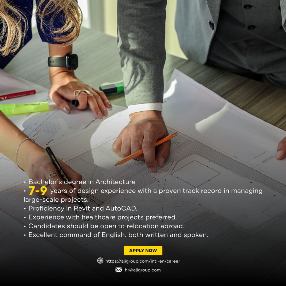 تعلن AJi Group عن توفر شاغر مهندس معماري أول (Senior Architect) للعمل في عمّان – الأردن ضمن فريقنا المتخصص.