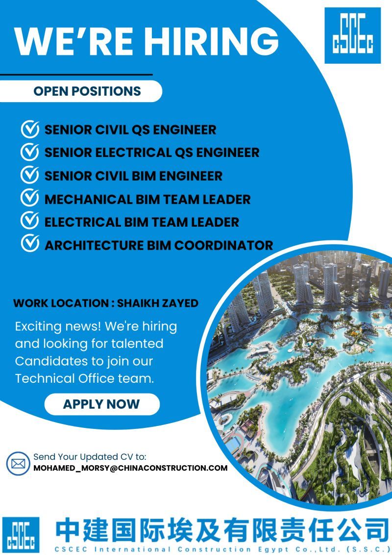 تُعلن شركة CSCEC International Construction Egypt عن حاجتها إلى تعيين عدد من الكفاءات الهندسية للعمل ضمن فريق المكتب الفني بموقع الشركة في الشيخ زايد.