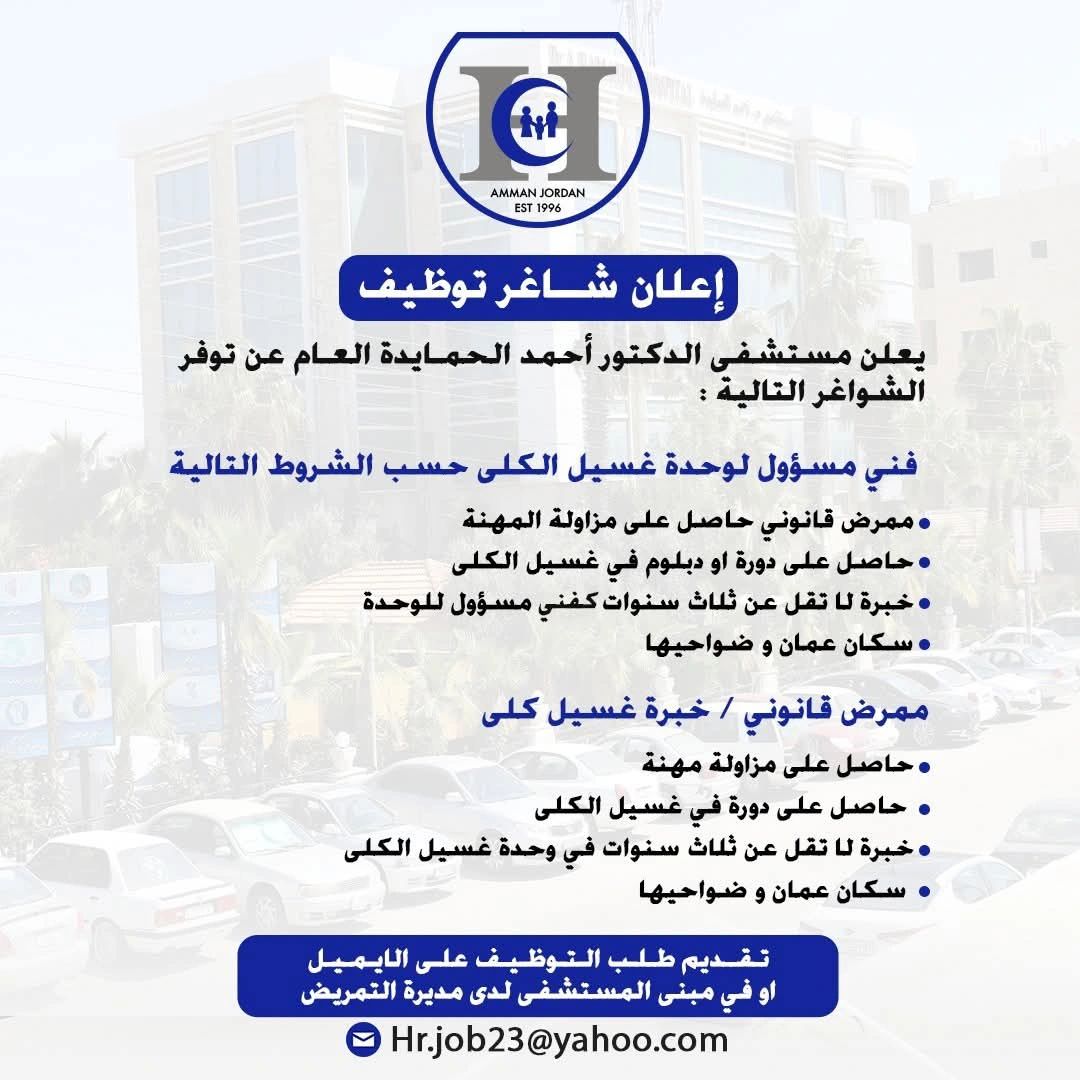 وظائف تمريض في عمّان 2025 | فني وممرض غسيل كلى – مستشفى الدكتور أحمد الحمايدة