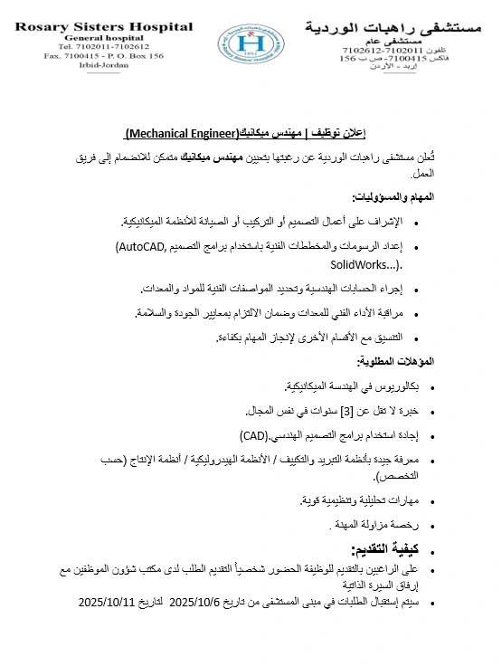 يُعلن مستشفى راهبات الوردية في مدينة إربد عن حاجته لتعيين مهندس ميكانيك ذو خبرة للانضمام إلى فريق العمل الهندسي.