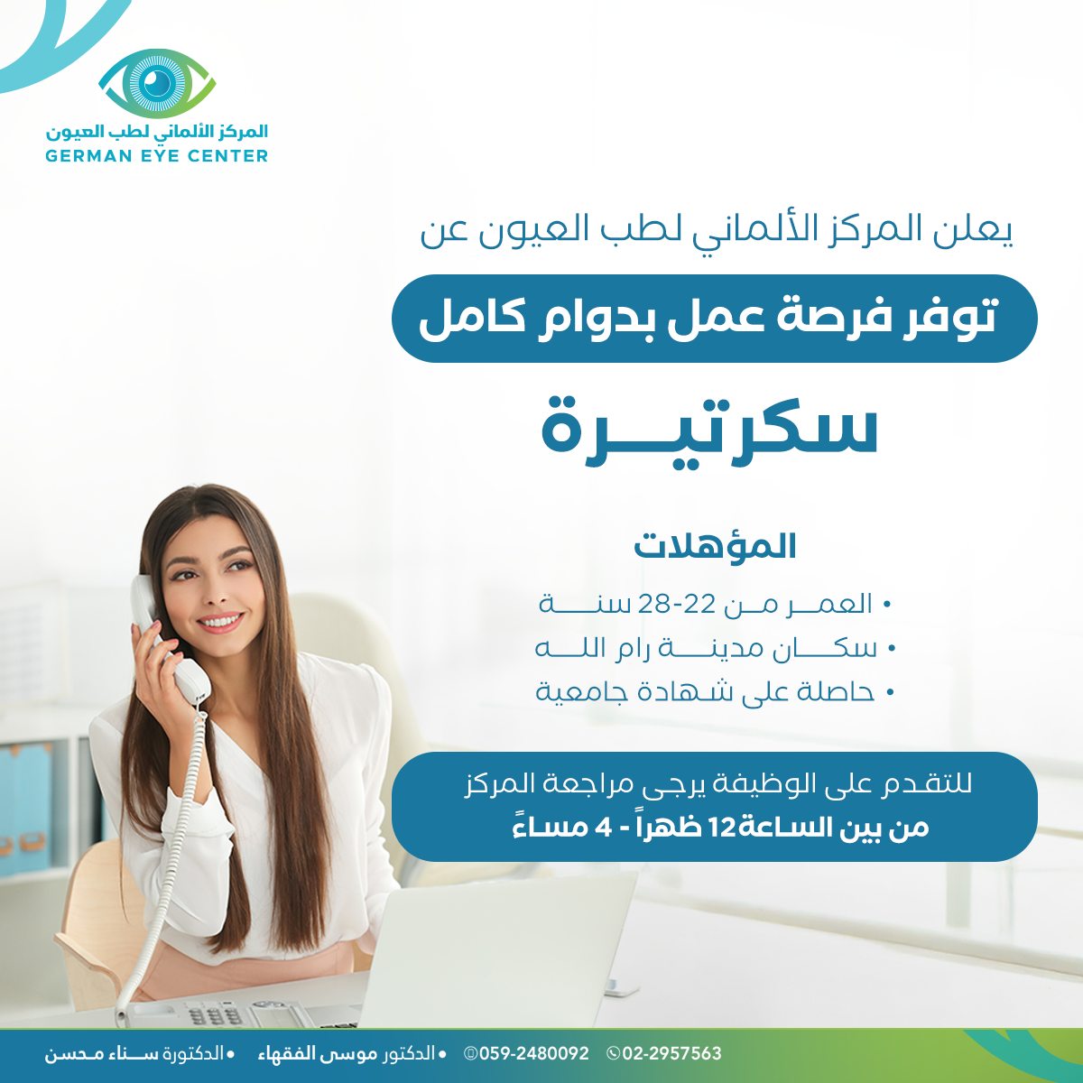 يعلن المركز الألماني لطب وجراحة العيون عن حاجته لتعيين موظفة سكرتيرة بدوام كامل للانضمام إلى فريق العمل في المركز.