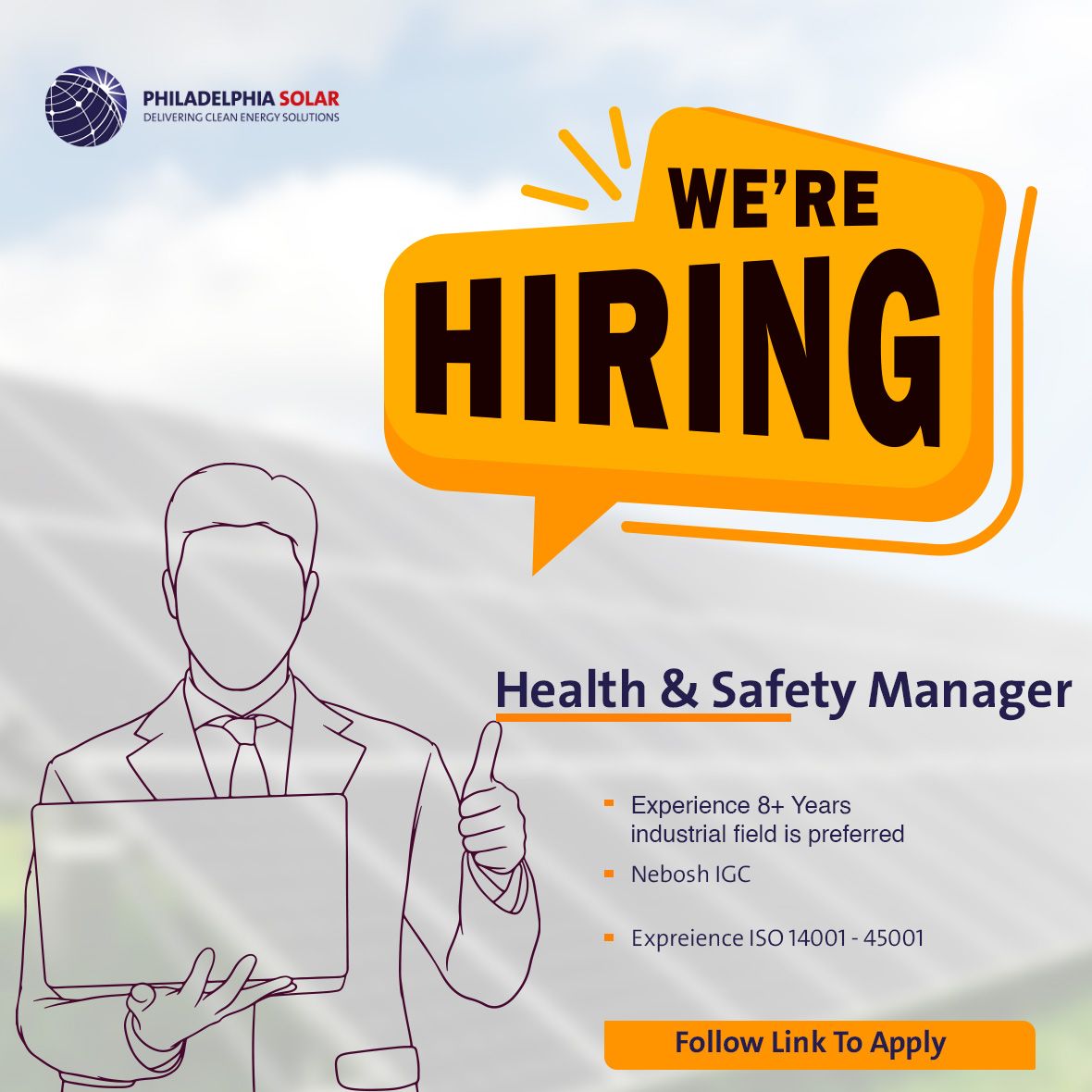 تُعلن مجموعة شركات فيلادلفيا للطاقة الشمسية عن توفر شاغر وظيفي بمسمى مدير الصحة والسلامة المهنية (Health & Safety Manager) للانضمام إلى فريق العمل في مدينة عمّان.