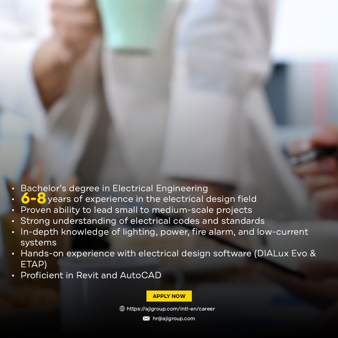 تُعلن شركة AJ عن حاجتها لتوظيف مهندسين كهرباء من ذوي الخبرة (6 إلى 8 سنوات) للانضمام إلى فريق التصميم الهندسي للعام 2025.