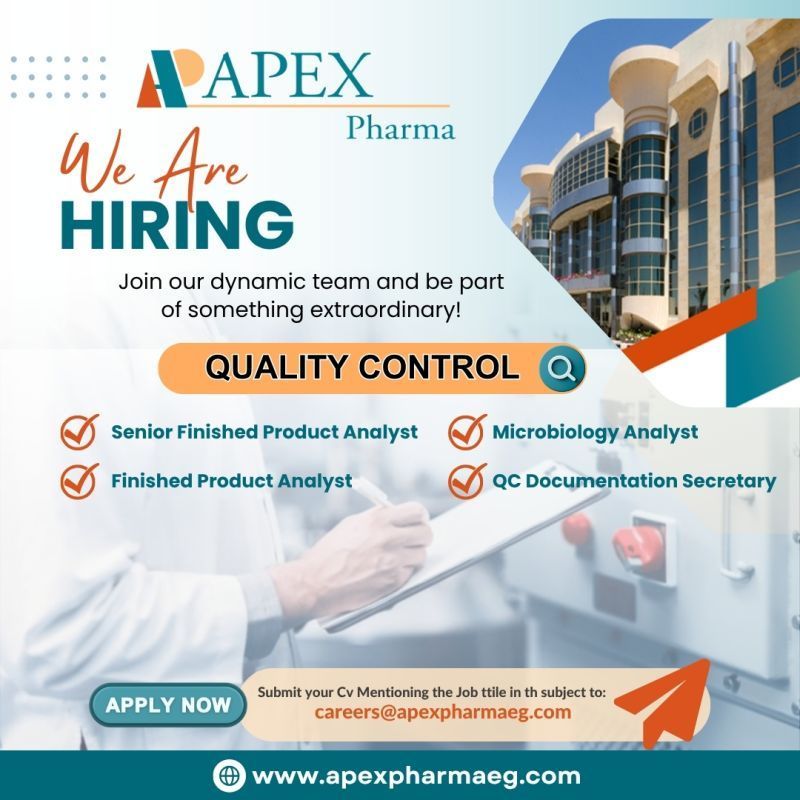 تُعلن شركة Apex Pharma عن توفر فرص عمل مميزة ضمن فريق Quality Control في مصر. إذا كنت تبحث عن بيئة عمل ديناميكية وفرصة لتطوير مسارك المهني، انضم إلينا الآن!