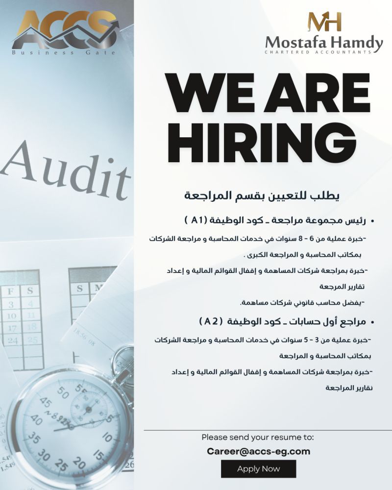فرص وظائف محاسبة ومراجعة في القاهرة 2025 – شركة ACCS بالتعاون مع Mostafa Hamdy – Chartered Accountants، تعلن عن توفر فرص متميزة للتعيين الفوري في قسم المراجعة.