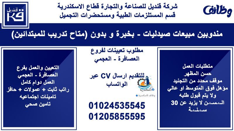 تُعلن شركة قديل للصناعة والتجارة – قطاع الإسكندرية، قسم المستلزمات الطبية ومستحضرات التجميل عن فتح باب التعيين لوظيفة:
