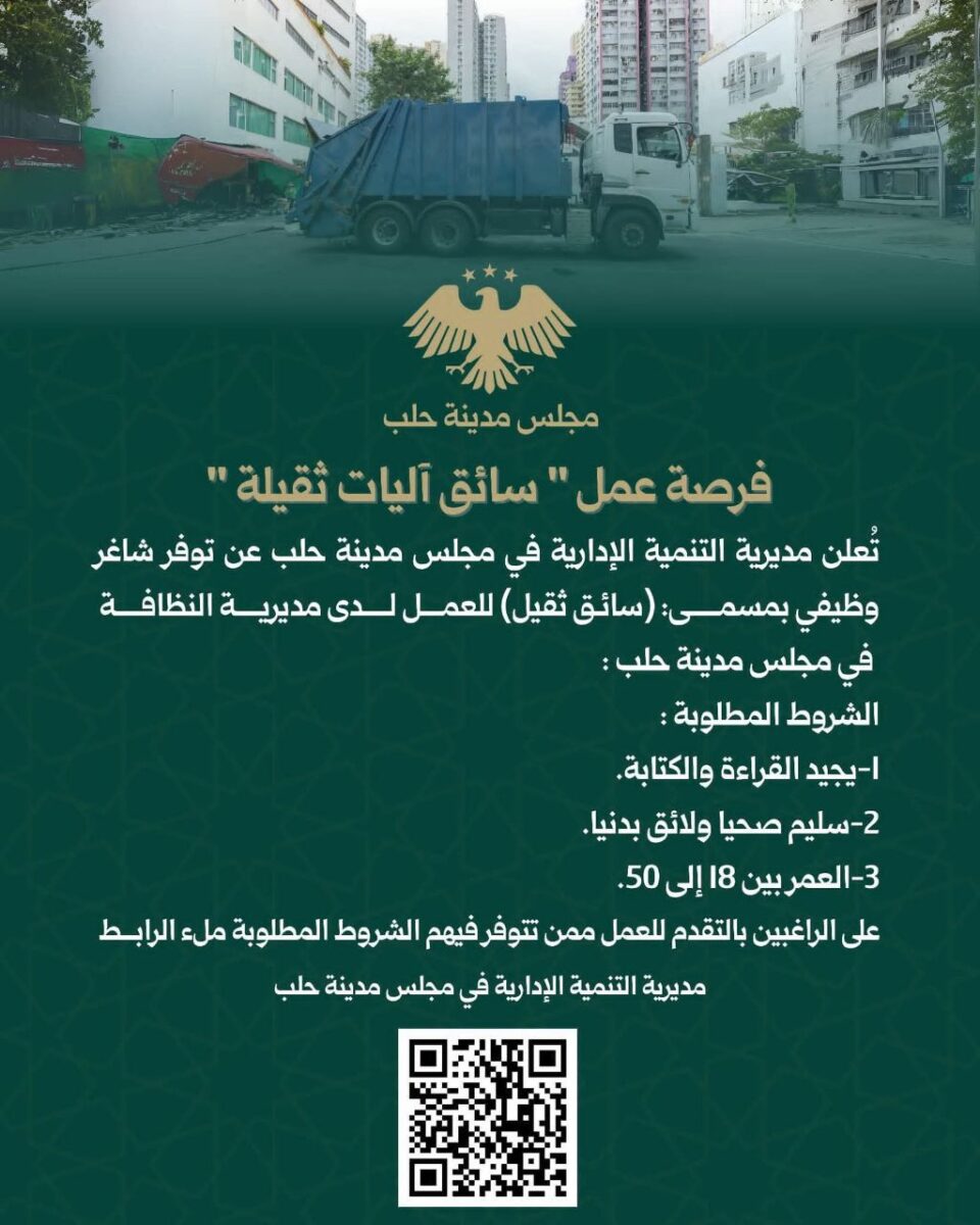 📢 تُعلن مديرية التنمية الإدارية في مجلس مدينة حلب عن توفر شاغر وظيفي بمسمى سائق ثقيل للعمل لدى مديرية النظافة في مجلس المدينة.