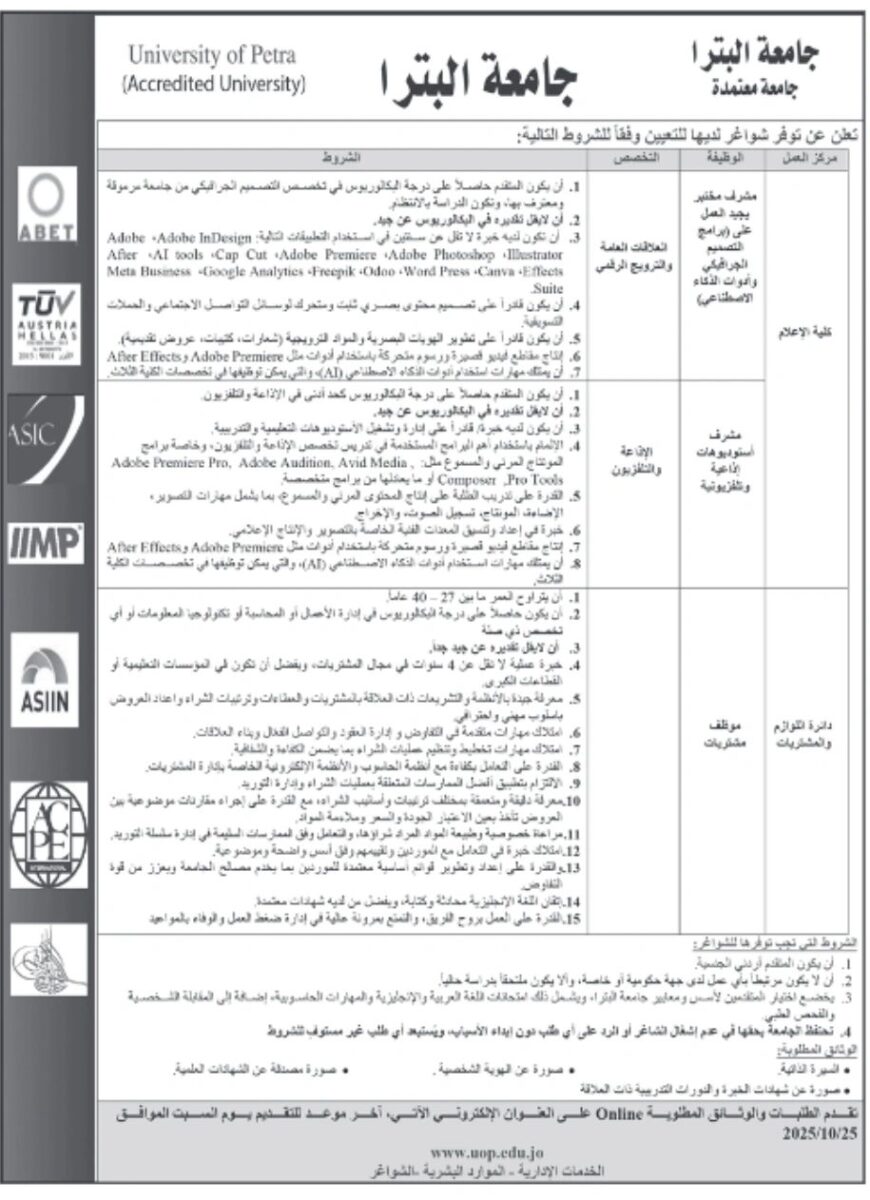 تعلن جامعة البتراء عن حاجتها لملء وظائف شاغرة في تخصصات إعلام وفق الشروط التالية: