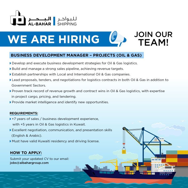 تعلن شركة Al-Bahar Shipping عن حاجتها لتوظيف Business Development Manager – Projects (Oil & Gas) للانضمام إلى فريقها في الكويت لعام 2025.