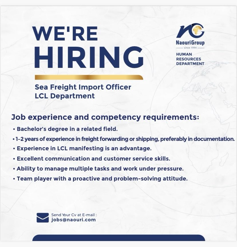 تعلن شركة Naouri Group عن توفر شاغر موظف استيراد شحن بحري – قسم LCL في مقرها في عمّان. إذا كنت تمتلك خبرة في الشحن أو التوثيق البحري، فهذه فرصتك للانضمام إلى فريق احترافي في مجال الخدمات اللوجستية.