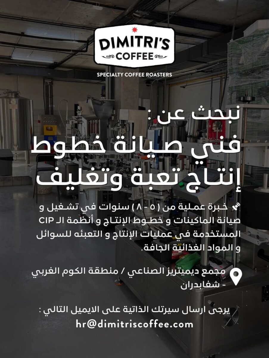وظائف فنية صيانة خطوط إنتاج متوفرة الآن في ديميتريز كوفي – شفا بدران، 2025!
