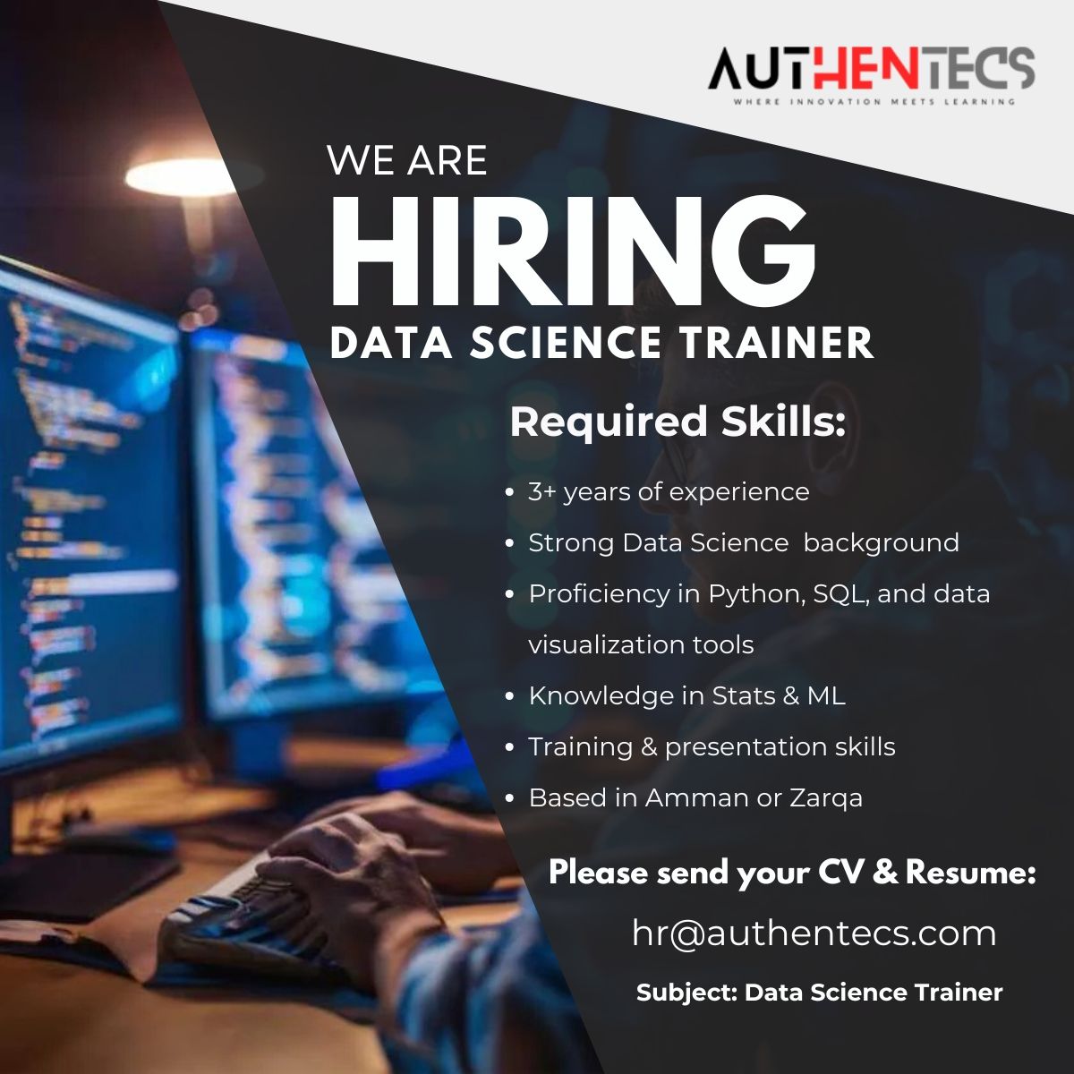 تعلن شركة Authentecs عن وظيفة مدرب علوم البيانات ضمن برامجها التدريبية في عمان والزرقاء لعام 2025، لتأهيل الكفاءات الشابة في مجال البيانات والذكاء الاصطناعي.