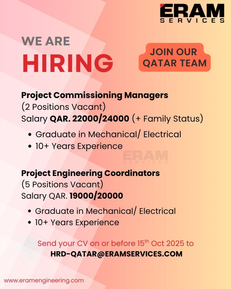 تُعلن شركة ERAM Services عن توفر وظائف هندسية شاغرة في قطر للعام 2025، برواتب تنافسية وفرص عمل مع فريق احترافي في بيئة مشاريع متميزة.