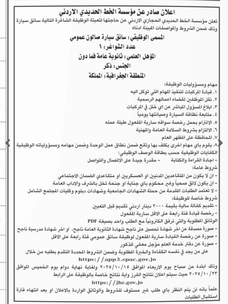 أعلنت مؤسسة الخط الحديدي الحجازي الأردني عن حاجتها لتعيين سائق سيارة صالون عمومي، ضمن الشروط والمواصفات التالية: