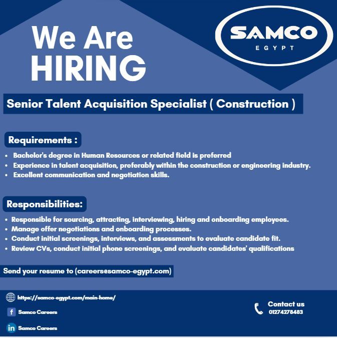 تعلن شركة سامكو مصر عن حاجتها لتعيين Senior Talent Acquisition Specialist – أخصائي أول اكتساب المواهب (تخصص إنشاءات) للانضمام إلى فريق الموارد البشرية.