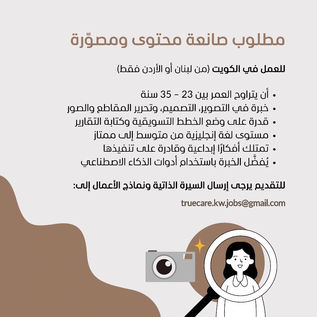 شركة في الكويت تبحث عن صانعة محتوى ومصوّرة متميزة للعمل ضمن فريقها الإبداعي.