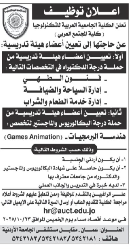 🔎 وظائف أكاديمية في عمان 2025 – الكلية الجامعية العربية للتكنولوجيا