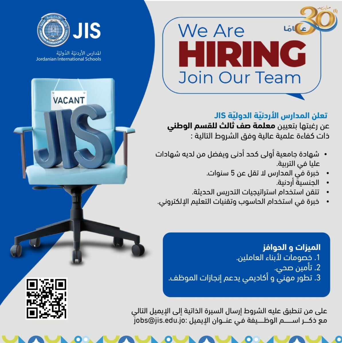 تُعلن المدارس الأردنية الدولية (JIS) عن رغبتها في تعيين معلمة صف ثالث في القسم الوطني، وفقًا للشروط التالية:
