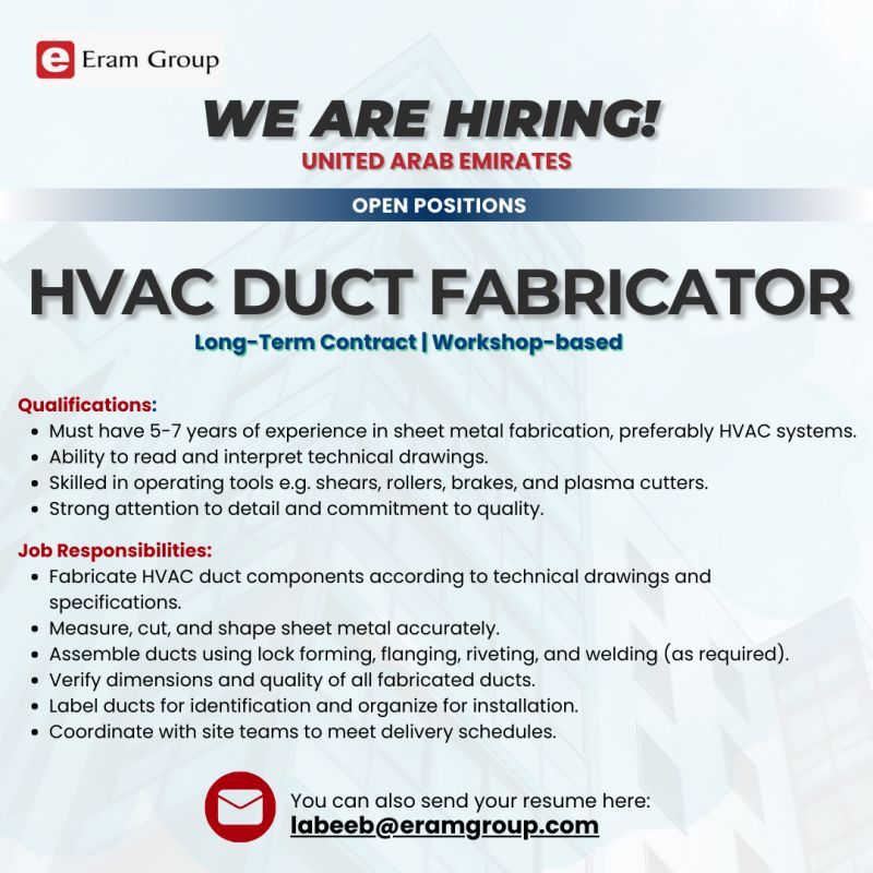 ✅ خبرة من 5 إلى 7 سنوات في تشكيل الصفائح المعدنية، ويفضل في أنظمة HVAC