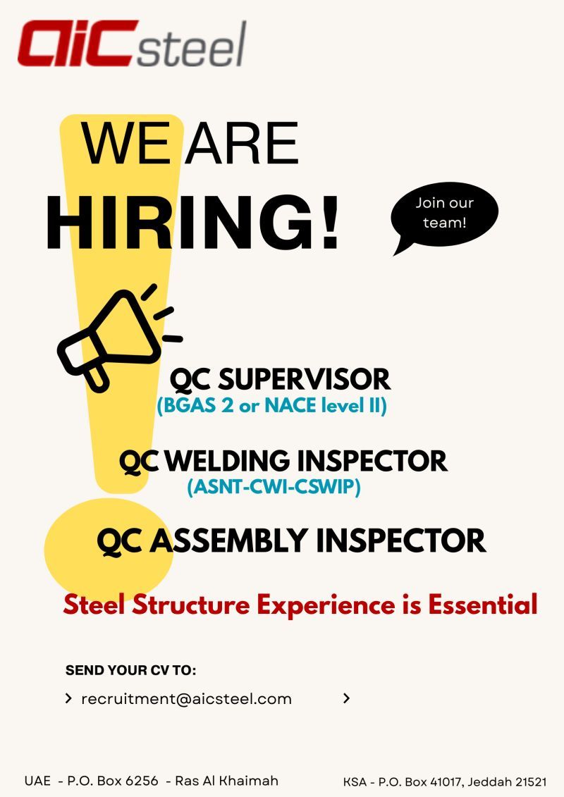 تعلن شركة AIC Steel الرائدة في صناعة الهياكل الحديدية عن توفر وظائف شاغرة بمجال مراقبة الجودة في فروعها بالإمارات (رأس الخيمة) والسعودية (جدة).