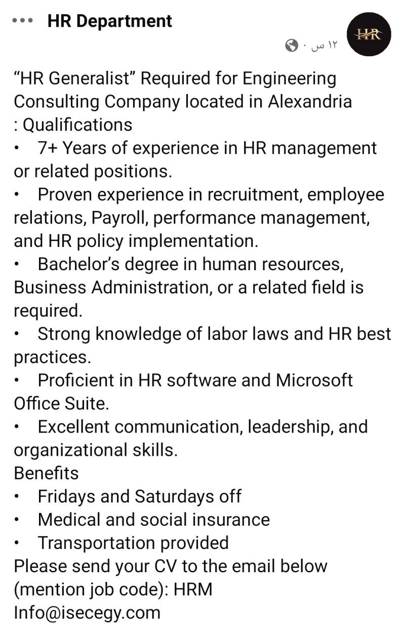 📍 HR Generalist – شركة هندسية – الإسكندرية
