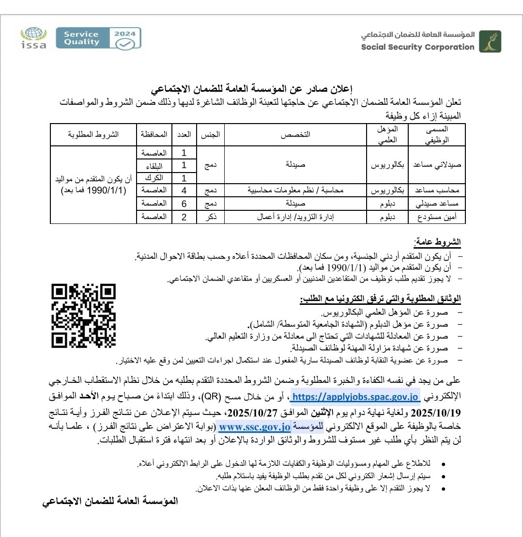 مطلوب موظفين للعمل لدى المؤسسة العامة للضمان الاجتماعي – عمان الأردن 2025