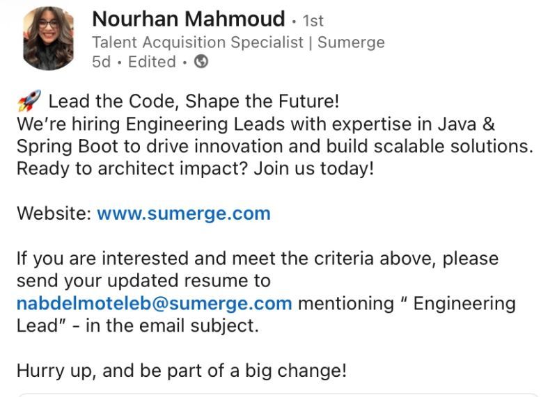 🚀 1. فرصة عمل – Engineering Lead (Java & Spring Boot) – شركة Sumerge