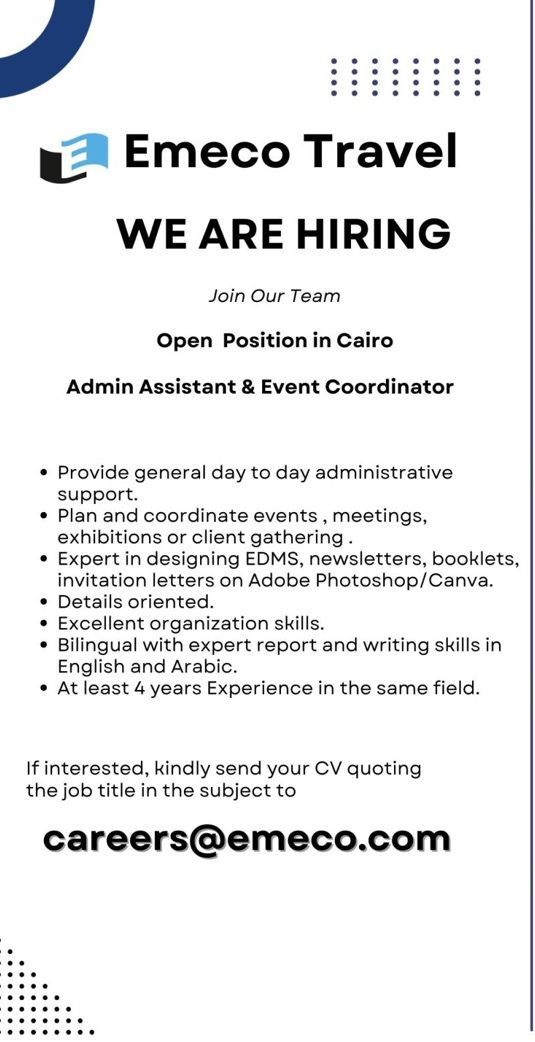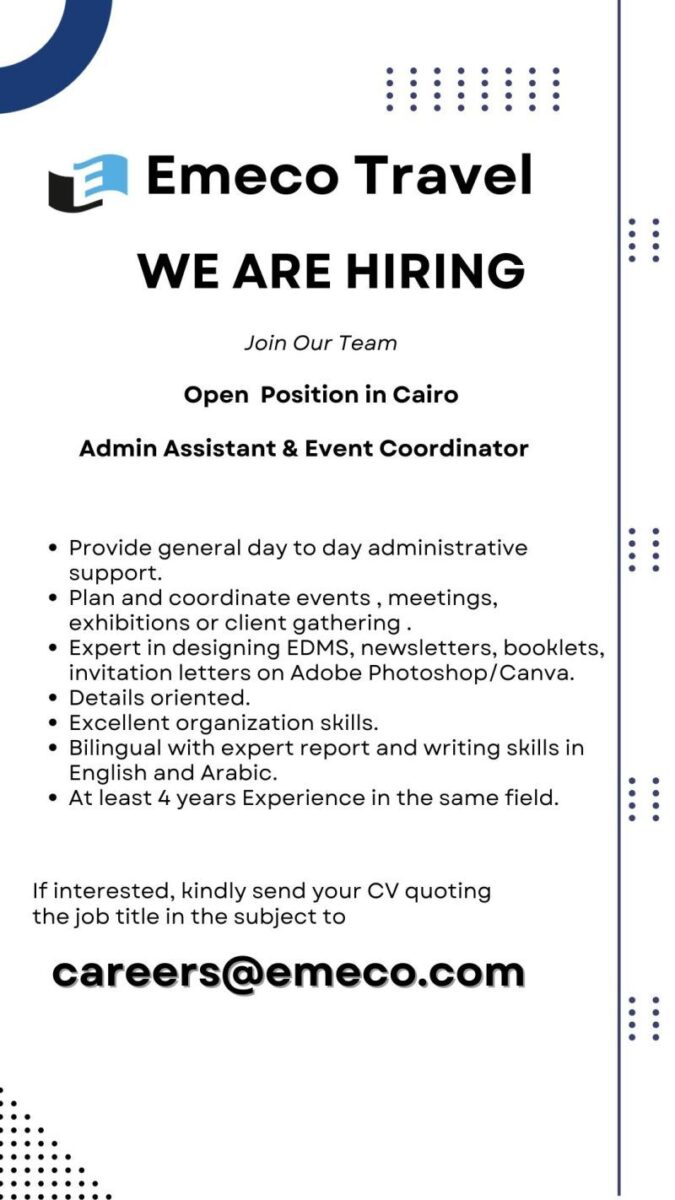 ✨ 3. Admin Assistant & Event Coordinator – Emeco Travel – القاهرة