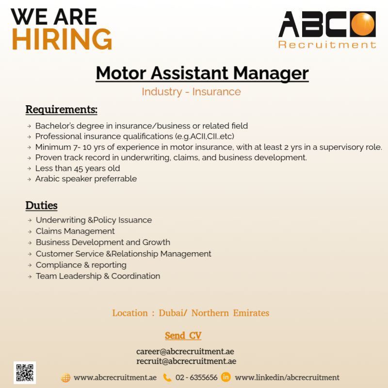مساعد مدير تأمين سيارات (Motor Assistant Manager)