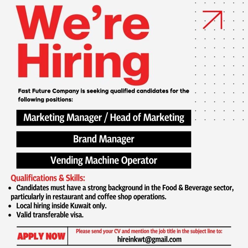 تعلن شركة Fast Future المتخصصة في قطاع الأغذية والمشروبات عن توفر وظائف شاغرة مميزة داخل دولة الكويت للعام 2025.
