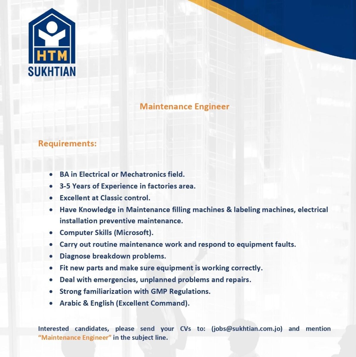 تُعلن شركة HTM Sukhtian عن حاجتها لتعيين مهندس صيانة للعمل ضمن فريقها في عمان، الأردن، وذلك وفقًا للشروط التالية: