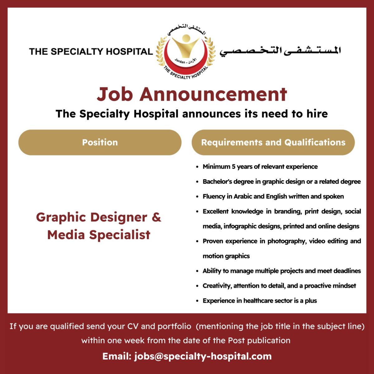 يعلن مستشفى التخصصي في عمّان – الأردن عن حاجته لتعيين مصمم جرافيك وأخصائي وسائط إعلامية ضمن فريقه الإبداعي لعام 2025.