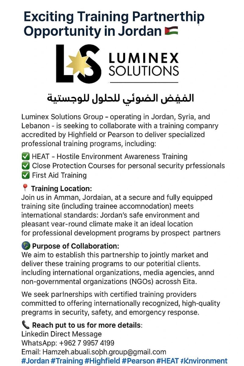 تُعلن شركة الفيض الضوئي للحلول اللوجستية ذ.م.م (Luminex Solutions Group)، العاملة في الأردن وسوريا ولبنان، عن رغبتها في التعاون مع شركة تدريب معتمدة من Highfield أو Pearson لتقديم برامج تدريبية احترافية في المجالات التالية: