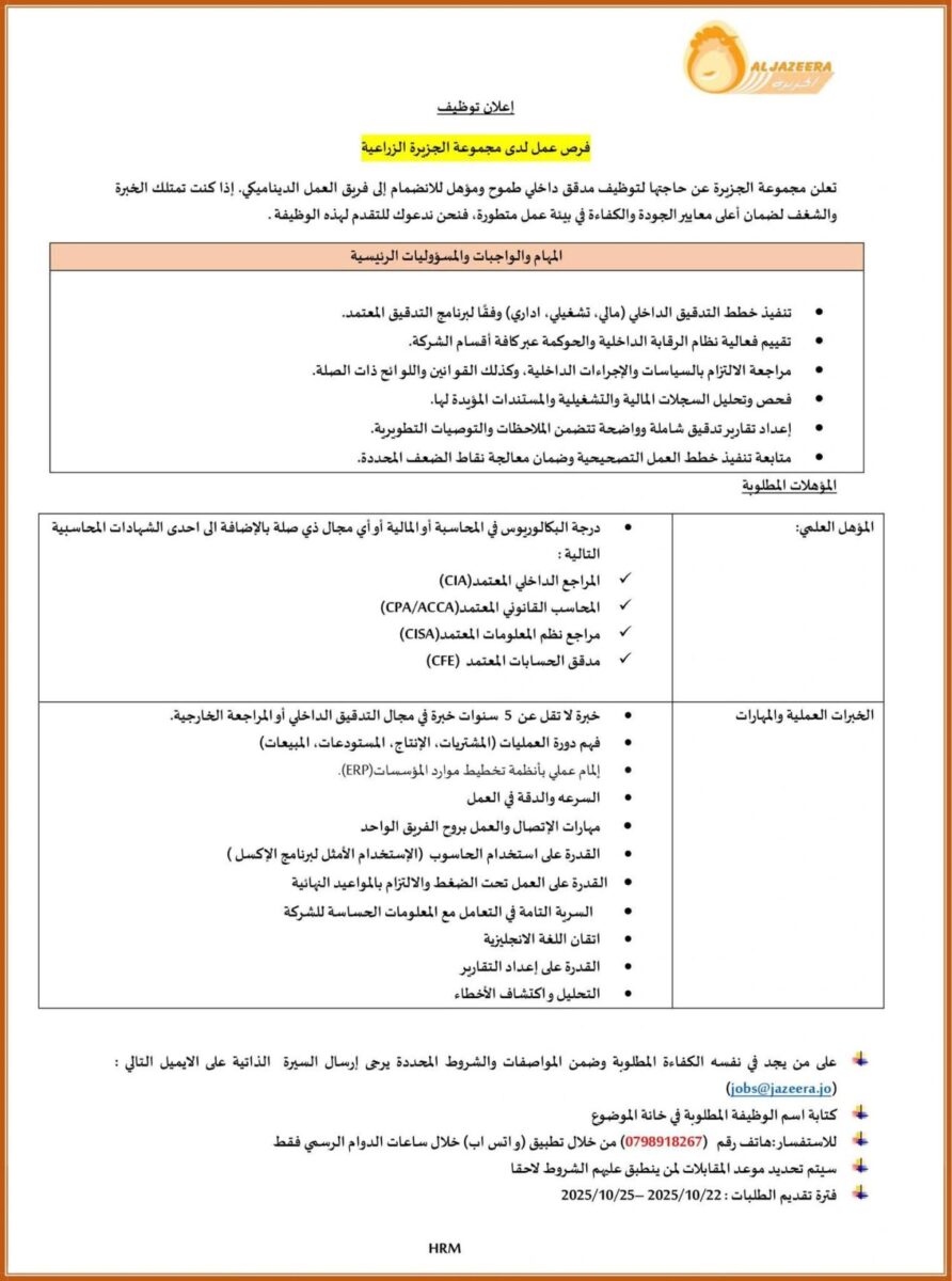 تسعى مجموعة الجزيرة الزراعية إلى ضم مدقق داخلي طموح ومؤهل ليكون جزءًا من فريقها الديناميكي، ويساهم في تطوير أداء الشركة وضمان أعلى معايير الجودة والكفاءة.