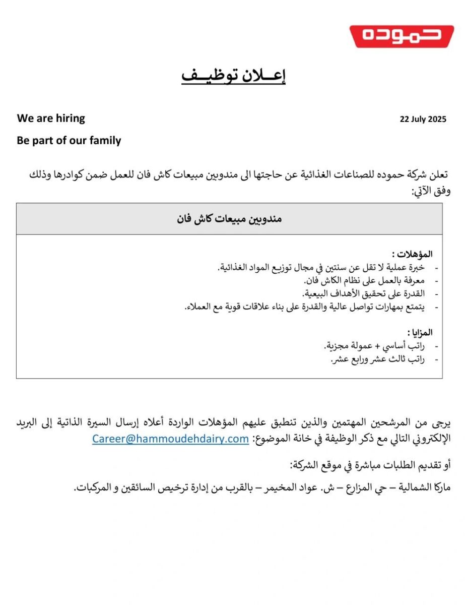 تُعلن شركة حمودة للصناعات الغذائية، إحدى كبرى الشركات الغذائية في الأردن، عن حاجتها لتعيين مندوبين مبيعات كاش فان للعمل ضمن كوادرها في عمّان، وفق المتطلبات التالية: