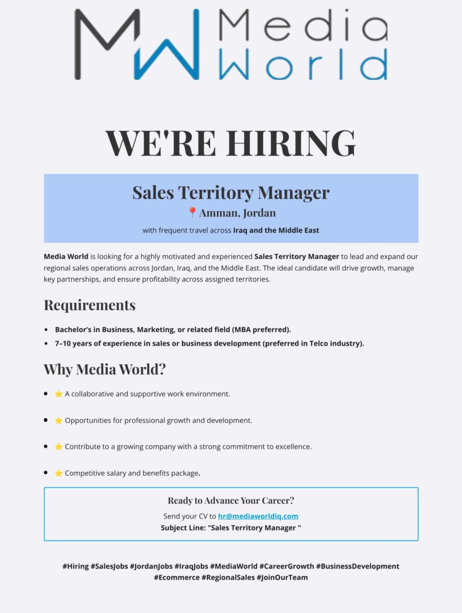 🎯 وظيفة مدير مبيعات إقليمي – Media World – عمّان 2025