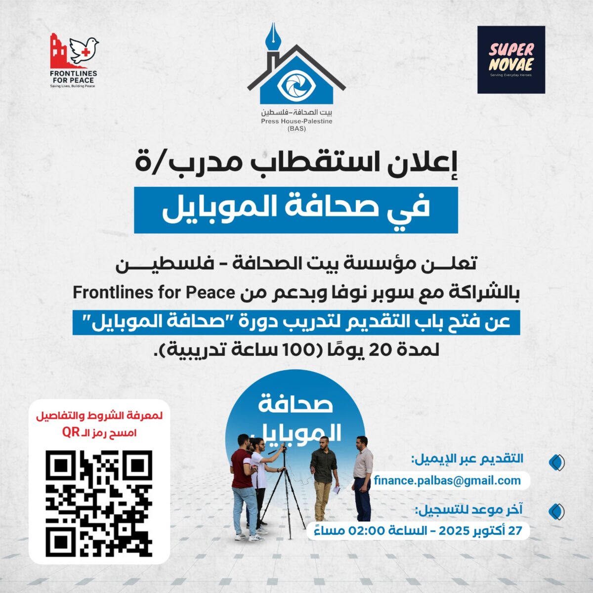 مطلوب مدرب/ة صحافة الموبايل للعمل مع مؤسسة بيت الصحافة – فلسطين في قطاع غزة لعام 2025، بالتعاون مع منظمة سوبر نوفا وبدعم Frontlines for Peace.