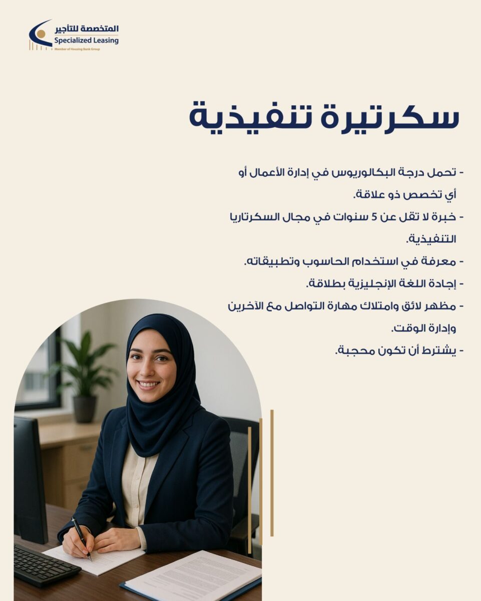 تعلن شركة المتخصصة للتأجير عن حاجتها إلى سكرتيرة تنفيذية ذات كفاءة عالية للعمل في بيئة عمل احترافية.